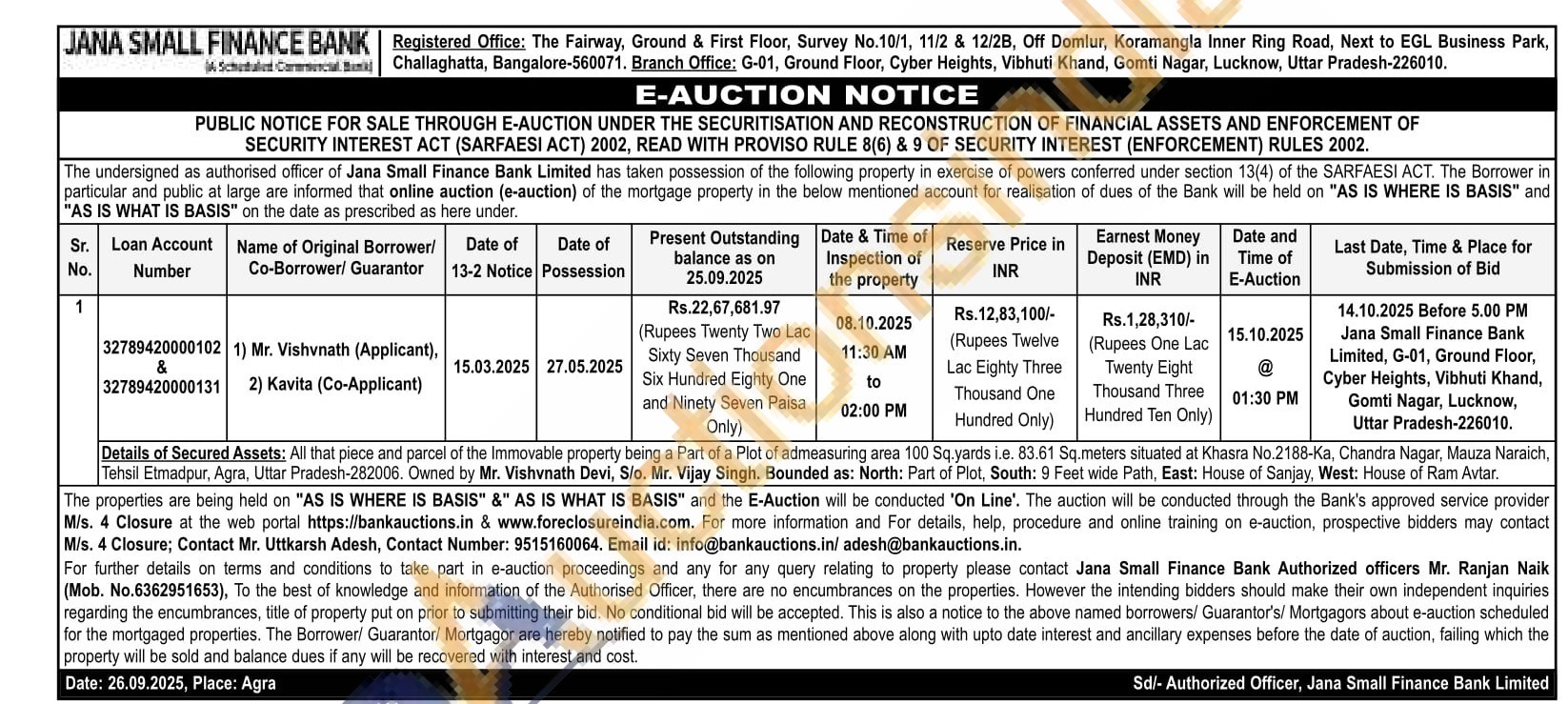All that piece and parcel of the Immovable property being a Part of a Plot of admeasuring area 100 Sq.yards i.e. 83.61 Sq.meters situated at Khasra No.2188-Ka, Chandra Nagar, Mauza Naraich, Tehsil Etmadpur, Agra, Uttar Pradesh-282006. Owned by Mr. Vishvnath Devi, S/o. Mr. Vijay Singh. Bounded as: North: Part of Plot, South: 9 Feet wide Path, East: House of Sanjay, West: House of Ram Avtar.