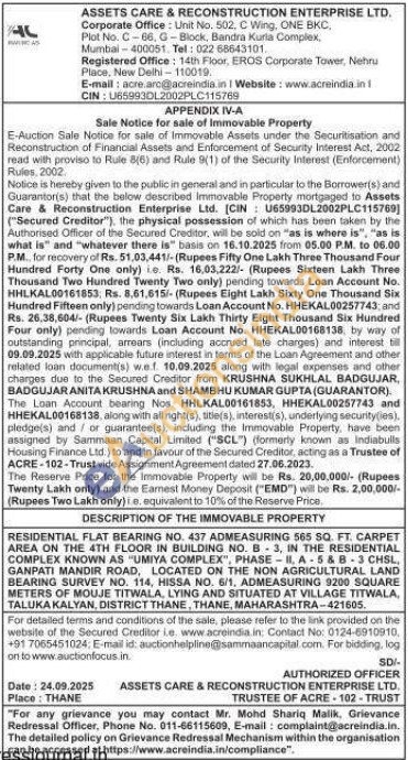 RESIDENTIAL FLAT BEARING NO. 437 ADMEASURING 565 SQ. FT. CARPET AREA ON THE 4TH FLOOR IN BUILDING NO. B3, IN THE RESIDENTIAL COMPLEX KNOWN AS "UMIYA COMPLEX", PHASE II, A-5&B-3 CHSL, GANPATI MANDIR ROAD, LOCATED ON THE NON AGRICULTURAL LAND BEARING SURVEY NO. 114, HISSA NO. 6/1, ADMEASURING 9200 SQUARE METERS OF MOUJE TITWALA, LYING AND SITUATED AT VILLAGE TITWALA, TALUKA KALYAN, DISTRICT THANE, THANE, MAHARASHTRA-421605.