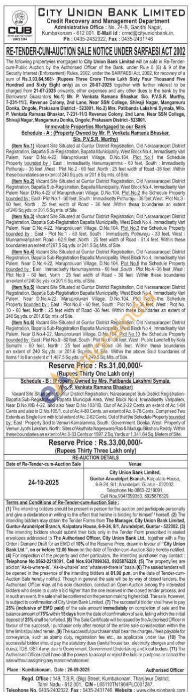 (Item No.1) Vacant Site Situated at Guntur District Registration, Old Narasaraopet. District Registration, Bapatia Sub-Registration, Bapatta Municipality, West Black No.4, Immadisetty Van Palem, Near D.No 4-22, Maruprokuvari Village, D.No.104, Plot No 1 the Schedule Property bounded by East Immadiselty Hanumayamma 60 feet, South Immadisetty Pothuraju 36 feet West: Plot No.2-60 feet North: 25 feet width of Road -36 feet Within these boundaries an extent of 240 Sq yds or 201.6 Sq.mts, of Site (Item No.2) Vacant Site Situated at Guntur District Registration, Old Narasaraopet District Registration, Bapatia Sub-Registration, Bapatia Municipality, West Block No.4, Immadisetty Vari Palem Near D.No.4-22 of Maruproluvari Vilage, D.No. 104, Plot No.2 the Schedule Property bounded by: East-Plot No.1-60 feet, South: Immadisetty Pothuraju-36 feet West Plot No 3-60 feet, North: 25 feet width of Road 36 feet Within these boundaries an extent of 240 Sq yds or 201.6 Sq.mts of Site [Item No.3) Vacant Site Situated at Guntur District Registration, Old Narasaraopet District Registration, Bapatla Sub-Registration Bapatia Municipality, West Block No.4, Immadisetry Vari Palem, Near D.No.4-22. Maruproluvari Village, D.No.104, Plot No.3 the Schedule Property bounded by East Plot No.1 60 feet, South Immadisetty Pothuraju 33 feet, West: Munnamvaripalem Road 62.9 feet North: 25 feet width of Road 51.4 feet. Within these boundaries an extent of 287.5 Sq yds. or 241.5 Sq Mts of Site. (Item No.4) Vacant Site Situated at Guntur District Registration, Old Narasaraopet District Registration, Bapatla Sub-Registration Bapalla Municipality, West Block No.4, Immadisetty Vari Palem, Near D.No.4-22. Maruproluvari Village, D.No. 104. Plot No.8 the Schedule Property bounded by: East Immadisetty Hanumayamma-60 feet, South Plot No.4-36 feet, West: Plot No.960 feet, North 25 feet width of Road 36 feet. Within these boundaries an extent of 240 Sq. yds, or 201.6 Sq.mts. of Site Item No.5) Vacant Site Situated at Guntur District Registration, Old Narasaraopet District Registration, Bapatla Sub-Registration Bapatla Municipality, West Block No. 4, Immadisetty Vari Palem, Near D.No.4-22, Maruproluvari Village, D.No. 104. Plot No.9 the Schedule Property bounded by East: Plot No.8-60 feet, South Plot No.5-36 feet. West: Plot No. 10-60 feet, North 25 feet width of Road -36 feet. Within these boundaries an extent of 240 Sq.yds. or 201.6 Sq.mts. of Site. (Item No.6) Vacant Site Situated at Guntur District Registration. Old Narasaraopet District Registration, Bapatla Sub-Registration Bapatla Municipality, West Block No.4, Immadisetty Van Palem, Near D.No.4-22, Maruproluvari Village, D.No. 104. Pxit No.10 the Schedule Property bounded by: East: Plot No.9-60 feet, South: Plot No.6-36 feet West Public Land left by Kola Sumathi 60 feet, North25 feet width of Road 36 feet, Within these boundaries an extent of 240 Sq.yds, or 201.6 Sq.mts. of Site. Within the above Said boundaries of Items 1 to 6 an extent of 1,487.5 Sq yds or 1,249.5 Sq. Mts of Site