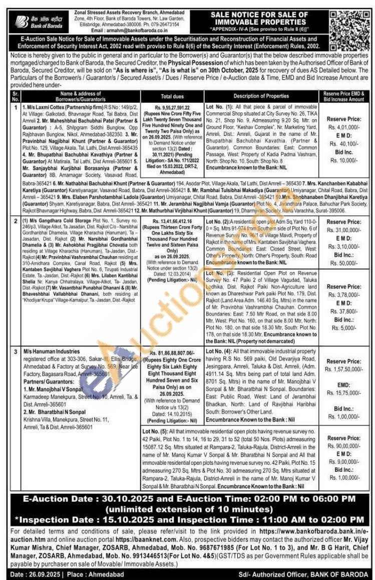 Lot No. (4): All that immovable industrial property having R.S No. 569 paiki, Old Devarjiya Road, Jesingpara, Amreli, Taluka & Dist. Amreli. (Adm. 4911.14 Sq. Mtrs being part of total land Adm. 8701 Sq. Mtrs) in the name of Mr. Manojbhai V Sonpal & Mr. Bharatbhai N Sonpal. Boundaries: East: Public Road, West: Land of Jerambhal Bhadkan, North: Land of Ravjibhai Haribhai South: Borrower's Other Land.