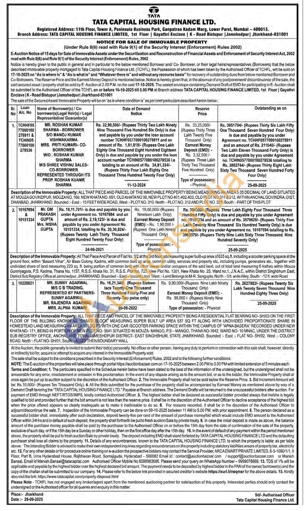 3) ALL THAT PIECE AND PARCEL OF THE IMMOVABLE PROPERTY BEING A RESIDENTIAL FLAT BEARING NO-SHING ON THE FIRST FLOOR OF THE BULDING KNOWN AS 'SHAKTI BLOCK MEASURING SUPER BUILT UP AREA 537 SQ FT ALONG WITH UNDIVIDED PROPORTIONATE SHARE IN HOMESTEAD LAND MEASURING AN AREA 100 SQ FT, WITH ONE CAR SCOOTER PARKING SPACE WITHIN THE CAMPUS OF "APNA BASERA RECORDED UNDER NEW KHATANO-171, BEING IN PORTION OF NEW PLOT NO-3641 SITUATED IN MOUZA-MANGO, PS-MANGO, THANA NO-1842, WARD NO-10 MNAC, UNDER THE DISTRICT SUB REGISTRY OFFICE, ANCHAL AND TOWN JAMESHDPUR DISTRICT EAST SINGHBHUM, STATE JHARKHAND. Bounded East FLAT NO-SHOZ West COLONY ROAD, North: FLAT NO-SH01, South: ALLEY THEN BOUNDARY WALL