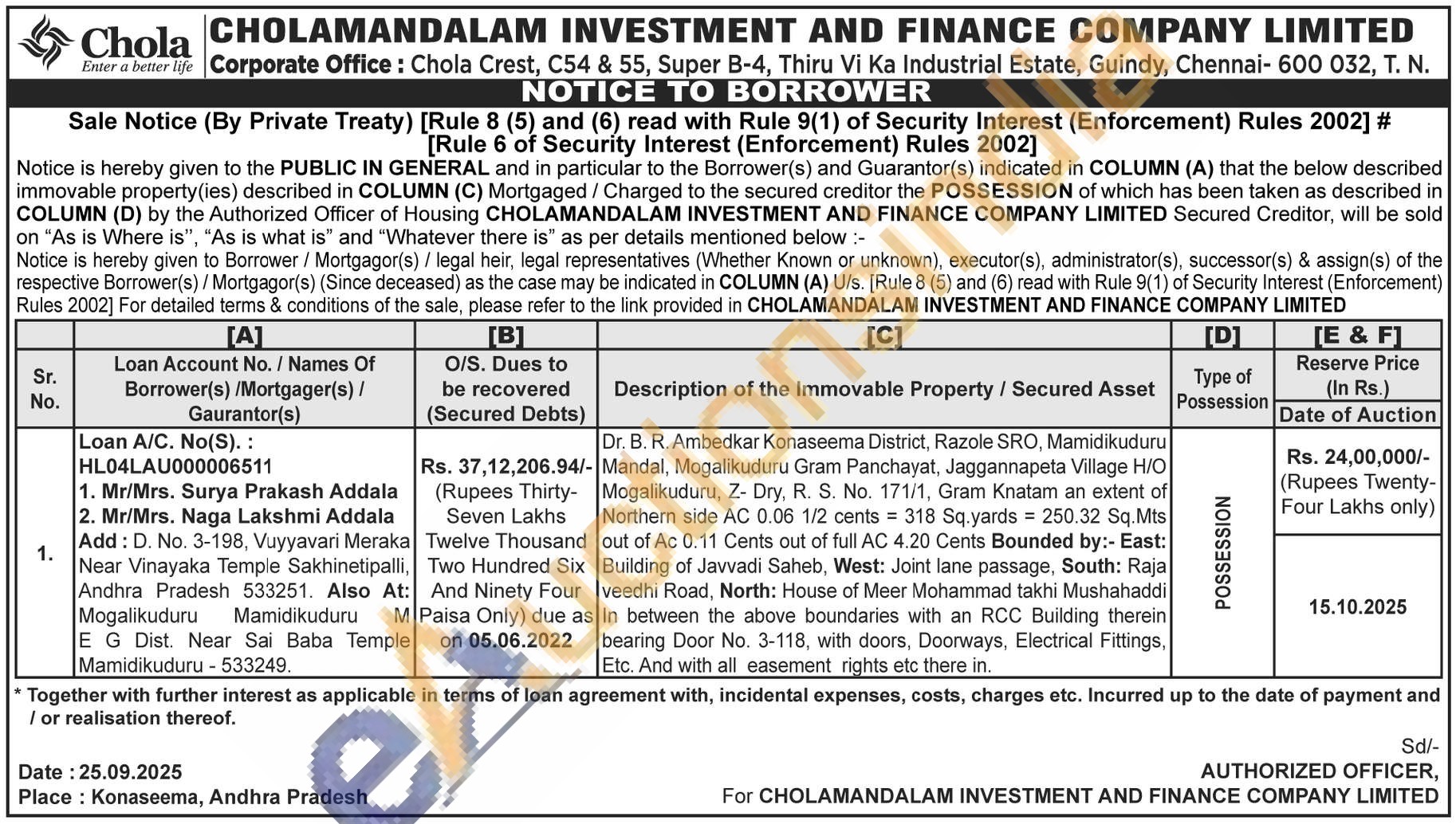 Dr. B. R. Ambedkar Konaseema District, Razole SRO, Mamidikuduru Mandal, Mogalikuduru Gram Panchayat, Jaggannapeta Village H/O Mogalikuduru, Z- Dry, R. S. No. 171/1, Gram Knatam an extent of Northern side AC 0.06 1/2 cents = 318 Sq.yards = 250.32 Sq.Mts out of Ac 0.11 Cents out of full AC 4.20 Cents Bounded by:- East: Building of Javvadi Saheb, West: Joint lane passage, South: Raja veedhi Road, North: House of Meer Mohammad takhi Mushahaddi In between the above boundaries with an RCC Building therein bearing Door No. 3-118, with doors, Doorways, Electrical Fittings, Etc. And with all easement rights etc there in.