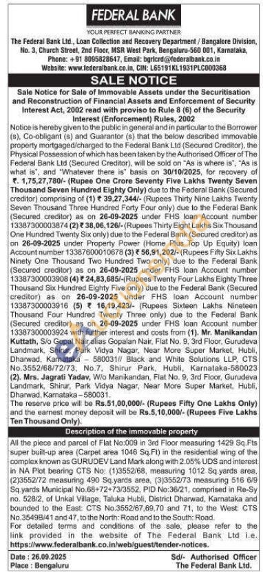 All the piece and parcel of Flat No:009 in 3rd Floor measuring 1429 Sq. Fts super bulit-up area (Carpet area 1046 Sq.Ft) in the residential wing of the complex known as GURUDEV Land Mark along with 2.05% UDS and interest in NA Plot bearing CTS No: (1)3552/68, measuring 1012 Sq.yards area, (2)3552/72 measuring 490 Sq yards area, (3)3552/73 measuring 516 6/9 Sq yards Municipal No.68-72+73/3552, PID No:36/21, comprised in Re-Sy no. 528/2, of Unkal Village, Taluka Hubli, District Dharwad, Karnataka and bounded to the East: CTS No.3552/67,69,70 and 71, to the West: CTS No.35498/41 and 47, to the North: Road and to the South: Road.