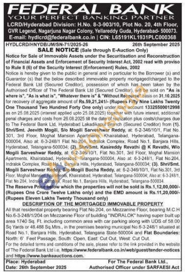 All that residential property bearing Flat No.204, on Mezzanine Floor, bearing M.CH No.6-3-248/1/204 on Mezzanine Floor of building "INDRALOK" having super built up area 1740 Sq. Ft. including common area with car parking along with UDS of 58.00 Sq Yards or 48.488 Sq.Mirs, in the premises bearing municipal No 6-3-248/1 situated at Road No.1, Banjara Hills, Hyderabad, Telangana State-500004 and Flat Boundaries: North: 6' Feet Passage, South Open, East: Cut Out, West Cut Out
