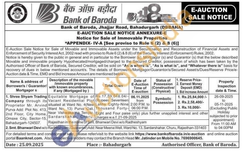 Equitable Mortgage its Vacant Residential Plot situated at Ward No. , Ward No. 13) Purva Gali , Near Vishwakarma Temple, , Sardarshahar, Churu Rajasthan in the name of Smt Bhanwari Devi w/o Radheshyam