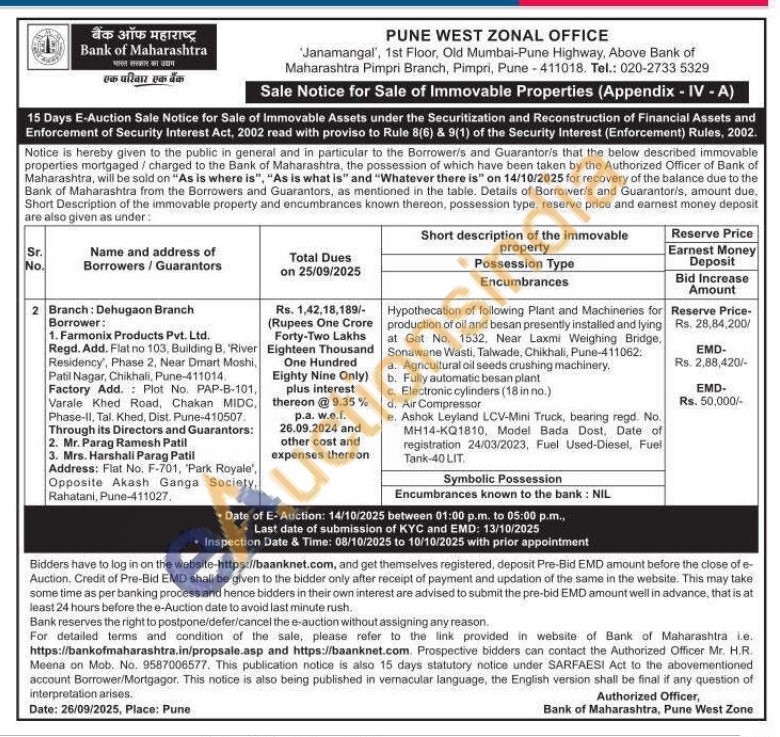 Hypothecation of following Plant and Machineries for production of oil and besan presently installed and lying at Gat No. 1532, Near Laxmi Weighing Bridge, Sonawane Wasti, Talwade, Chikhali, Pune-411062: a. Agricultural oil seeds crushing machinery. b. Fully automatic besan plant c. Electronic cylinders (18 in no.) d. Air Compressor e. Ashok Leyland LCV-Mini Truck, bearing regd. No. MH14-KQ1810, Model Bada Dost, Date of registration 24/03/2023, Fuel Used-Diesel, Fuel Tank-40 LIT.