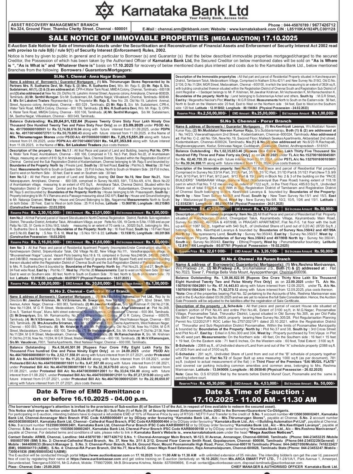 1) Item No.1.1: All that Piece and parcel of Land and Building, bearing Plot No. CPR-4, Water Tank Road, Arumbakkam, Chennai 600 106, Comprised in T.S. No.5 Part, Block No.22, of Arumbakkam Village, measuring an extent of 810 Sq.ft in Aminjikarai Taluk, Chennai District, Situated within the Registration District of Chennai Central and the Sub Registration District of Kodambakkam, Chennai belonging to Mr. Raju S and bounded by: Boundaries of the Property: North by: Private Land, South by: 50 feet Road, East by: Plot No.5, West by: 30 Feet Road. Measurements North to South on Eastem Side: 25 Ft.6 Inches, North to South on Western Side: 28 Ft.6 Inches, East to west on Northern Side: 30 feet, East to west on Southern side: 30 feet. Item No.1.2: All that Piece and parcel of Land and Building, bearing Old Door No.19, New Door No.21, New Natarajapuram, Aminjikarai, Chennai 600 029, comprised in Survey No.46/3, 59/1, T.S.No.4/9, 4/14, Block No .22 of Arumbakkam village, measuring to an extent of 470 Sq.ft, Aminjikarai Taluk, Chennai District, Situated within the Registration District of Chennai Central and the Sub Registration District of Kodambakkam, Chennai belonging to Mr. Raju S and bounded by: Boundaries of the Property: North by: House belonging to Mr. Prasanajeeth, South by: Property belonging to Mr. R.V. Ramana and a Passage measuring about 3X2.6 Ft, East by: House and Ground belonging to Mr. Nataraja Gramani, West by: House and Ground Belonging to Mrs, Nagammal Measurements North to South on both Sides: 20 Feet, East to West on both Sides: 25 Ft 6 Inches, Latitude: 13.068790; Longitude: 80.215865 (Constructive Possession-22.03.2024)