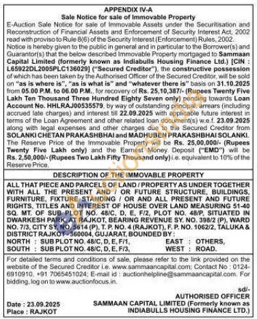 ALL THAT PIECE AND PARCELS OF LAND/PROPERTY AS UNDER TOGETHER WITH ALL THE PRESENT AND/OR FUTURE STRUCTURE, BUILDINGS, FURNITURE, FIXTURE STANDING OR AND ALL PRESENT AND FUTURE RIGHTS, TITLES AND INTEREST OF HOUSE OVER LAND MEASURING 51-40 SQ. MT. OF SUB PLOT NO. 48/C, D, E, F/2, PLOT NO. 48/P, SITUATED IN DWARKESH PARK, AT RAJKOT, BEARING REVENUE SY. NO. 398/2 (P), WARD NO. 7/3, CITY SY, NO. 5614 (P), T. P. NO. 4 (RAJKOT), F. P. NO. 1062/2, TALUKA & DISTRICT RAJKOT-360004, GUJARAT.