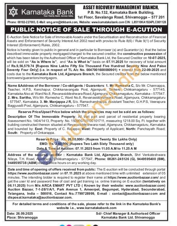 All that part and parcel of residential property bearing Assessment No. 1404/1413, Property No. 150900700100101711, measuring 1218.00 Sq. Ft. together with building constructed thereon situated at Revanasiddeshwara road, Ajjampura, Chikkamagaluru, Karnataka and bounded by: East: Property of C. Rajappa; West: Property of Applicant; North: Panchayath Road; South: Property of Onkarappa.
