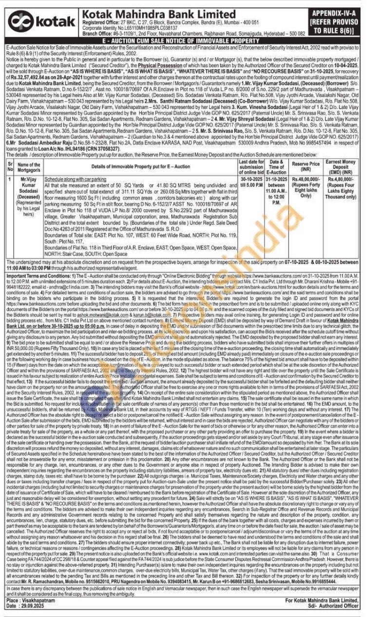 All that site measured an extent of 50 SQ Yards or 41.80 SQ MTRS being undivided and specified share out of total extenct of 311.11 SQYds or 260.08 Sq Mtrs together with flat in third floor measuring 1600 Sq Ft (including common areas, corridors balconies etc) along with car parking measuring 50 Sq Ft in stilt floor, bearing D No. 6-152/2/7 ASST No. 100018/70697 of AR Enclave in Plot No 118 of VUDA LP No.8/ 2000 covered by S.No.229/2 part of Madhurawada village, Greater Visakhapatnam, Municipal corporation, area, Madhurawada Registration Sub Disttrict and the total extent bounded by. (Boundaries of the total site) Under Regd. Sale Deed Doc No 4263 of 2011 Registered at the Office of Madhuravada S. R.O Boundaries of Total site: EAST: Plot No. 107, WEST: 60 Feet Wide Road, NORTH: Plot No. 119, South: Plot No. 117. Boundaries of Flat No. 118 in Third Floor of A.R. Enclave, EAST: Open Space, WEST: Open Space, NORTH: Stair Case, SOUTH: Open Space
