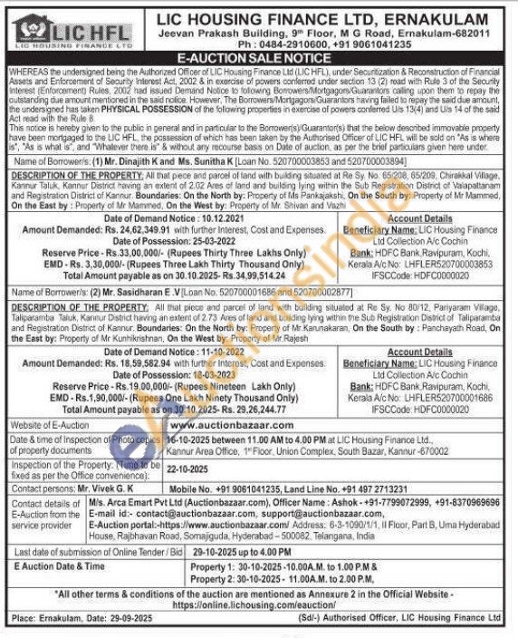 1)All that piece and parcel of land with building situated at Re Sy No. 65/208, 65/209, Chirakkal Village, Kannur Taluk, Kannur District having an extent of 2.02 Ares of land and building lying within the Sub Registration District of Valapattanam and Registration District of Kannur. Boundaries: On the North by: Propeny of Ms Pankajaksh. On the South by: Property of Mr Mammed, On the East by: Property of Mr Mammed, On the West by: Property of Mr. Shivan and Vazhi