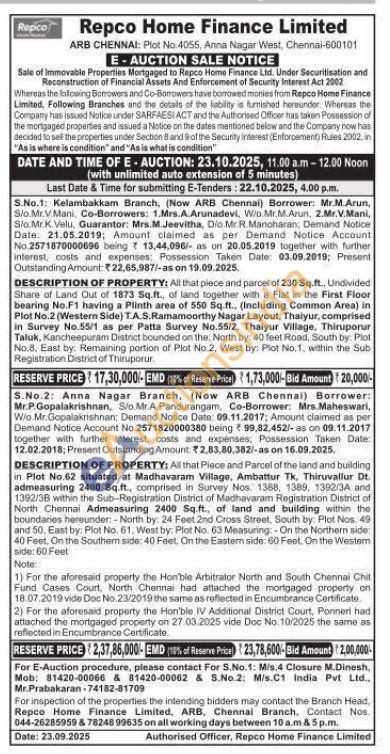 1) All that piece and parcel of 230 Sq.ft., Undivided Share of Land Out of 1873 Sq.ft., of land together with a Flat in the First Floor bearing No.F1 having a Plinth area of 550 Sq.ft., (Including Common Area) in Plot No.2 (Western Side) T.A.S.Ramamoorthy Nagar Layout, Thaiyur, comprised in Survey No.55/1 as per Patta Survey No.55/2, Thaiyur Village, Thiruporur Taluk, Kancheepuram District bounded on the North by: 40 feet Road, South by: Piot No.8, East by: Remaining portion of Plot No. 2, West by: Plot No.1, within the Sub Registration District of Thiruporur