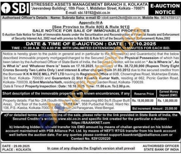 Property details: Flat No-2/A (South-Western side), measuring 660 Sq ft (Super Built Area), 2nd floor of the building name: "SREEMA", 958 Purbachal Road, Ward No: 106. P.S.-Kasba, Kolkata-700078, Dist.-South 24 Paraganas, West Bengal.