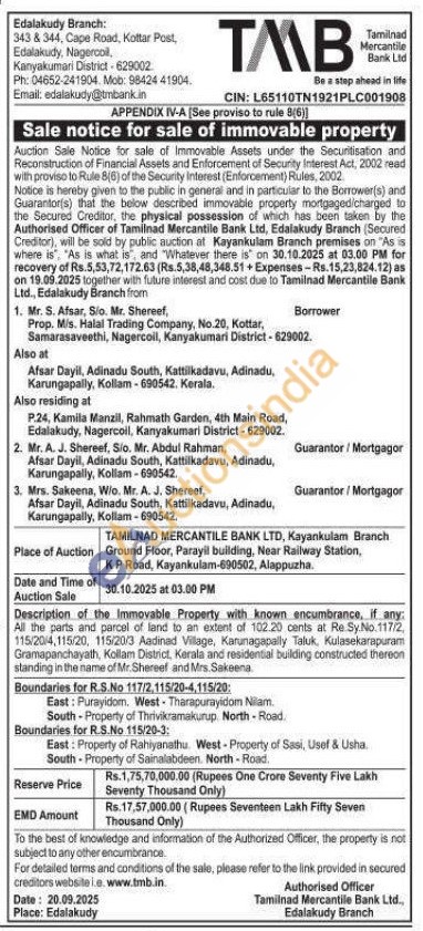 All the parts and parcel of land to an extent of 102.20 cents at Re Sy.No.117/2 115/20/4,115/20, 115/20/3 Aadinad Village, Karunagapally Taluk, Kulasekarapuram Gramapanchayath, Kollam District, Kerala and residential building constructed thereon standing in the name of Mr. Shereef and Mrs. Sakeena