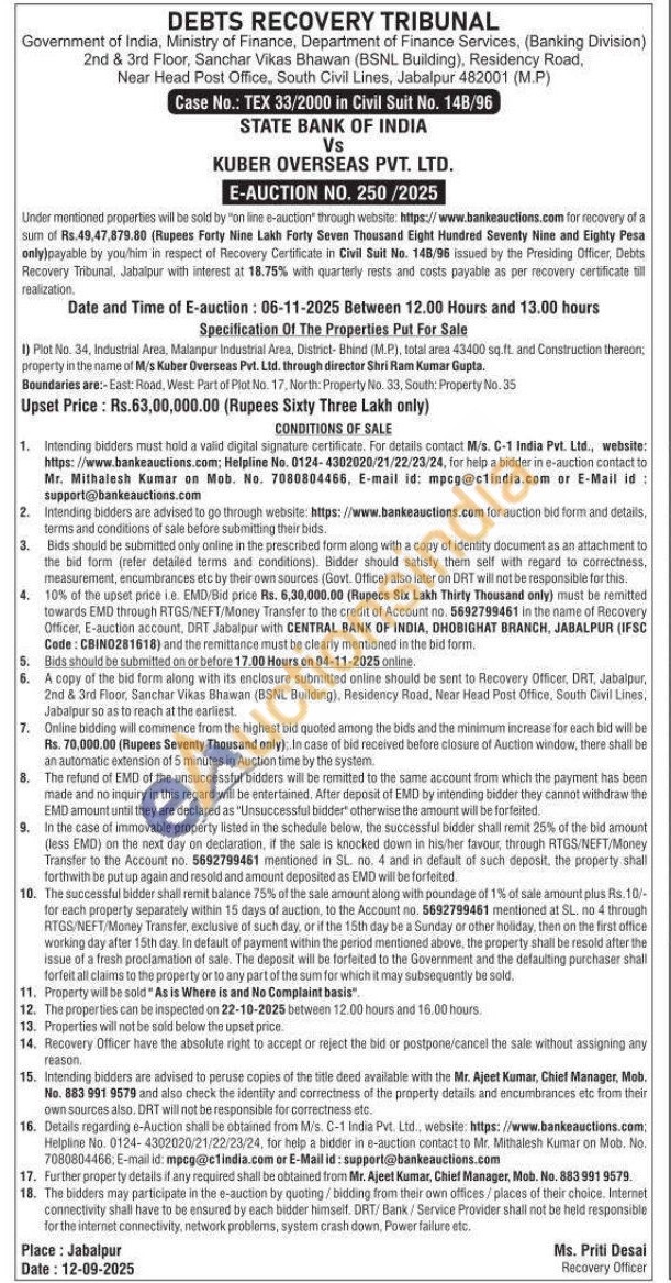 1) Plot No. 34, Industrial Area, Malanpur Industrial Area, District-Bhind (M.P), total area 43400 sq.ft. and Construction thereon property in the name of M/s Kuber Overseas Pvt. Ltd. through director Shri Ram Kumar Gupta. Boundaries are:-East: Road, West: Part of Plot No. 17, North: Property No. 33, South: Property No
