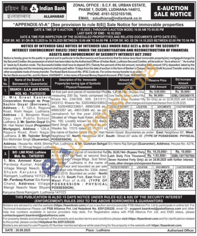 All that part and parcel of residential Plot measuring 200 Sq. Yards comprised in Khata No. 239/308, 309, 241/311 243/313, Khasra No. 5320/4902/3365/2 etc. 5320/4902/3365/1, 4899/3358 etc. 4900/3357 etc. 4901/3369 etc., as per Jamabandi for the year 2008-09. Situated at Village Ayali Kalan, Hadbast No. 155, Locality known as Shri Baba Nand Singh Ji Nagar, Ludhiana as per Wasika No. 11515 dated 20.10.2011 in the name of Sachin Goyal S/o Sh. Hari Narain Goyal, Boundaries as under: East: Neighbour 50, West: Neighbour 50, North: Neighbour 36'4", South: Street 20" wide 36'. (TYPE OF POSSESSION: PHYSICAL POSSESSION).