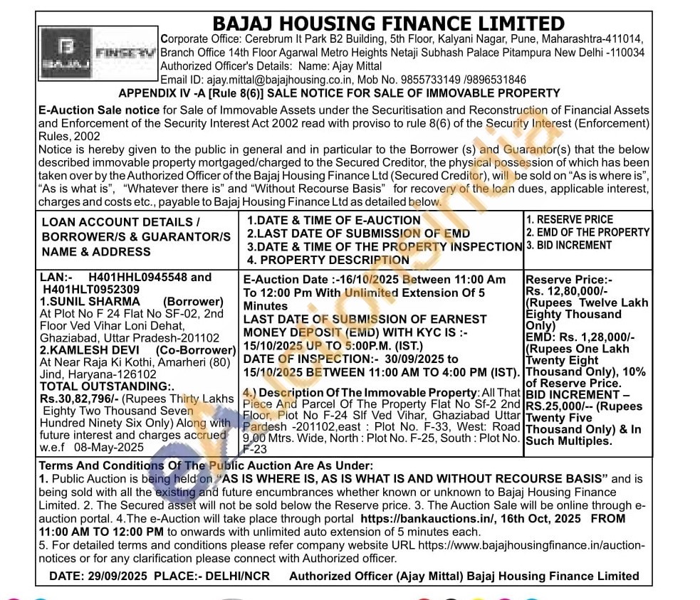 Description Of The Immovable Property: All That Piece And Parcel Of The Property Flat No Sf-2 2nd Floor, Plot No F-24 Slf Ved Vihar, Ghaziabad Uttar Pardesh -201102,east: Plot No. F-33, West: Road 9.00 Mtrs. Wide, North: Plot No. F-25, South: Plot No. F-23
