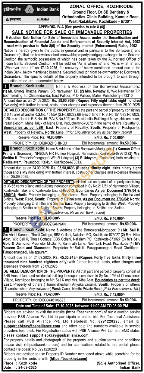 All the part and parcel of property consisting of 0.13 ares of land in R.S.No. 151/5A (S.No.602) 2.66 ares of land in R.S. No. 151/5 (S No.602), 0.26 ares of land in R.S.No. 151/5A (S.No.602) and Residential Building of Mayyazhi commune, Pallur Desom, Mahe Taluk of Mahe Dist, Puducherry-670672 in the name of Mrs. Revathy C. Boundaries as per LSR: East: Property of Revathy, South: Property of Pushpavlly, West: Property of Revathy, North: Lane. (Prior Encumbrance: Nil as per Bank record