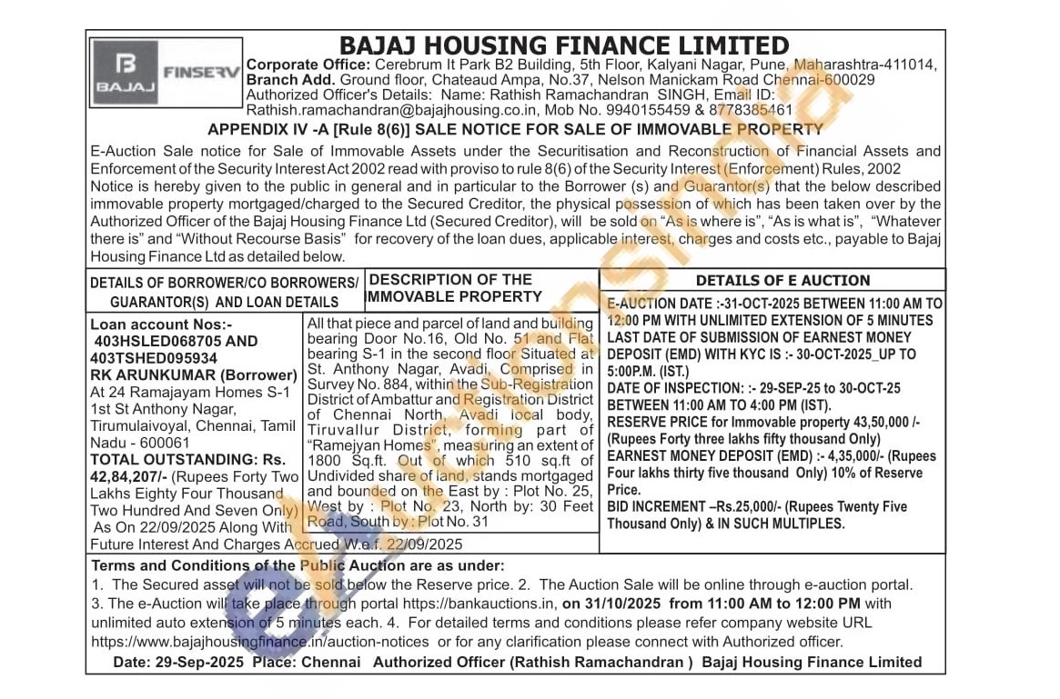 All that piece and parcel of land and building bearing Door No.16, Old No. 51 and Flat bearing S-1 in the second floor Situated at St. Anthony Nagar, Avadi, Comprised in Survey No. 884, within the Sub-Registration District of Ambattur and Registration District of Chennai North, Avadi local body, Tiruvallur District, forming part of "Ramejyan Homes", measuring an extent of 1800 Sq.ft. Out of which 510 sq.ft of Undivided share of land, stands mortgaged and bounded on the East by: Plot No. 25, West by: Plot No. 23, North by: 30 Feet Road, South by: Plot No. 31
