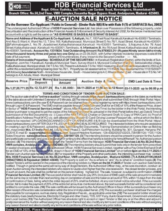 In Karaikudi Registration District, within the limits of Sub-Registrar, Joint No: 1 Karaikudi, Karaikudi Municipal Town, Survey Ward 4, Municipal Collection Ward 13, Sekkalaikottai village, Kattauthalaivasal, Municipal street, Old T.S.No. 165, Present subdivision T.S.No. 165/2 measuring about 5.86 cents equivalent to 2553 sq.ft within this a residential building bearing door No. 76/1, Property tax cid assessment no: 111/15409, new assessment No:111/016/00071 with following boundaries North-Amina beevi house site, South House belongs to A. C. Rhuma Beevi, East-Housesile in TS.No. 141 belongs to A.K.Adulla, West-Municipal Street
