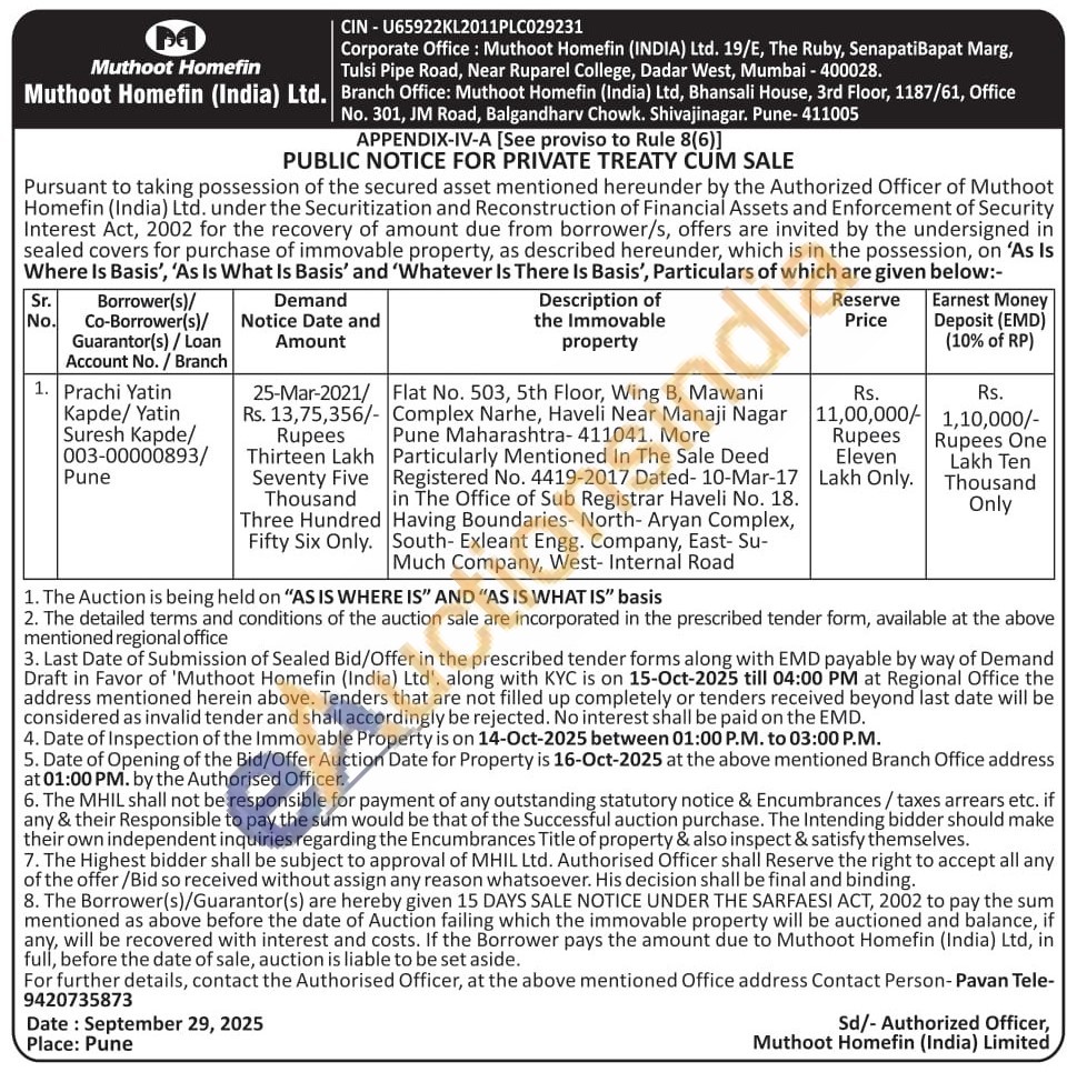 Flat No. 503, 5th Floor, Wing B, Mawani - Complex Narhe, Haveli Near Manaji Nagar Pune Maharashtra-411041. More Particularly Mentioned In The Sale Deed Registered No. 4419-2017 Dated-10-Mar-17 in The Office of Sub Registrar Haveli No. 18. Having Boundaries- North-Aryan Complex, South- Exleant Engg. Company, East- Su-Much Company, West- Internal Road