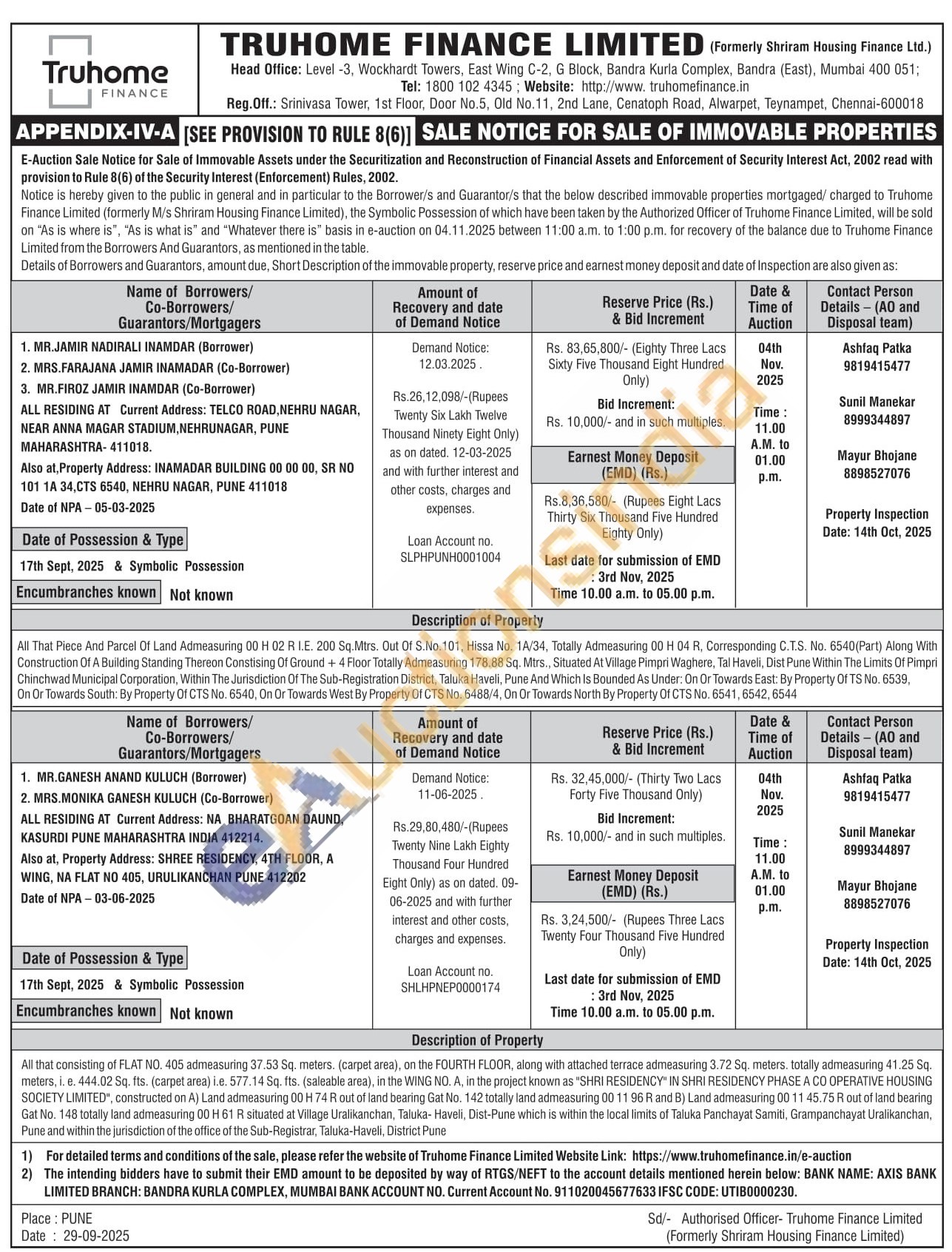 All that consisting of FLAT NO, 405 admeasuring 37.53 Sq. meters. (carpet area), on the FOURTH FLOOR, along with attached terrace admeasuring 3.72 Sq. meters. totally admeasuring 41.25 Sq. meters, i. e. 444.02 Sq. fts. (carpet area) i.e. 577.14 Sq. fts. (saleable area), in the WING NO. A, in the project known as "SHRI RESIDENCY IN SHRI RESIDENCY PHASE A CO OPERATIVE HOUSING SOCIETY LIMITED", constructed on A) Land admeasuring 00 H74 R out of land bearing Gat No. 142 totally land admeasuring 00 11 96 R and B) Land admeasuring 00 11 45.75 R out of land bearing Gat No. 148 totally land admeasuring 00 H 61 R situated at Village Uralikanchan, Taluka-Haveli, Dist-Pune which is within the local limits of Taluka Panchayat Samiti, Grampanchayat Uralikanchan, Pune and within the jurisdiction of the office of the Sub-Registrar, Taluka-Haveli, District Pune