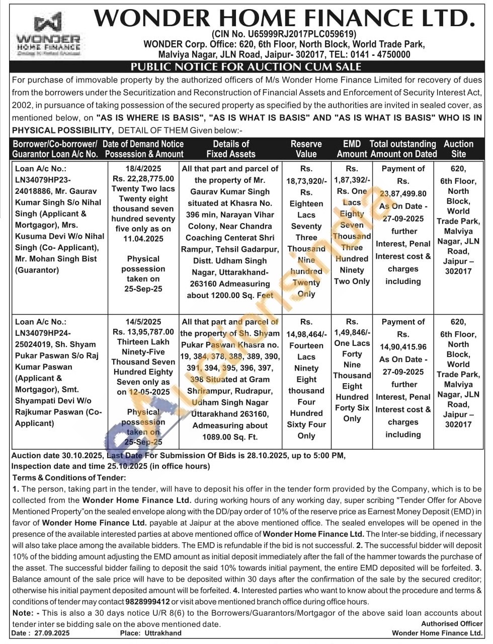 All that part and parcel of the property of Sh. Shyam Pukar Paswan Khasra no. 19, 384, 378, 388, 389, 390, 391, 394, 395, 396, 397, 398 Situated at Gram Shrirampur, Rudrapur, Udham Singh Nagar Uttarakhand 263160, Admeasuring about 1089.00 Sq. Ft.