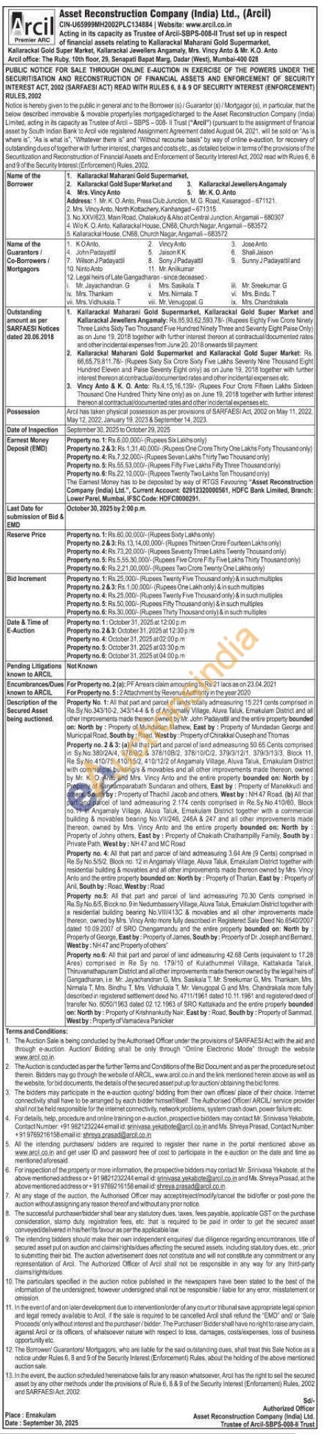 Property no.5: All that part and parcel of land admeasuring 70.30 Cents comprised in Re.Sy. No.6/5, Block no. 9 in Nedumbassery Village, Aluva Taluk, Emakulam District together with a residential building bearing No.VIII/413C & movables and all other improvements made thereon, owned by Mrs. Vincy Anto more fully described in Registered Sale Deed No.6540/2007 dated 10.09.2007 of SRO Chengamandu and the entire property bounded on: North by: Property of George, East by: Property of Jarnes, South by: Property of Dr. Joseph and Bernard, West by: NH 47 and Properly of others