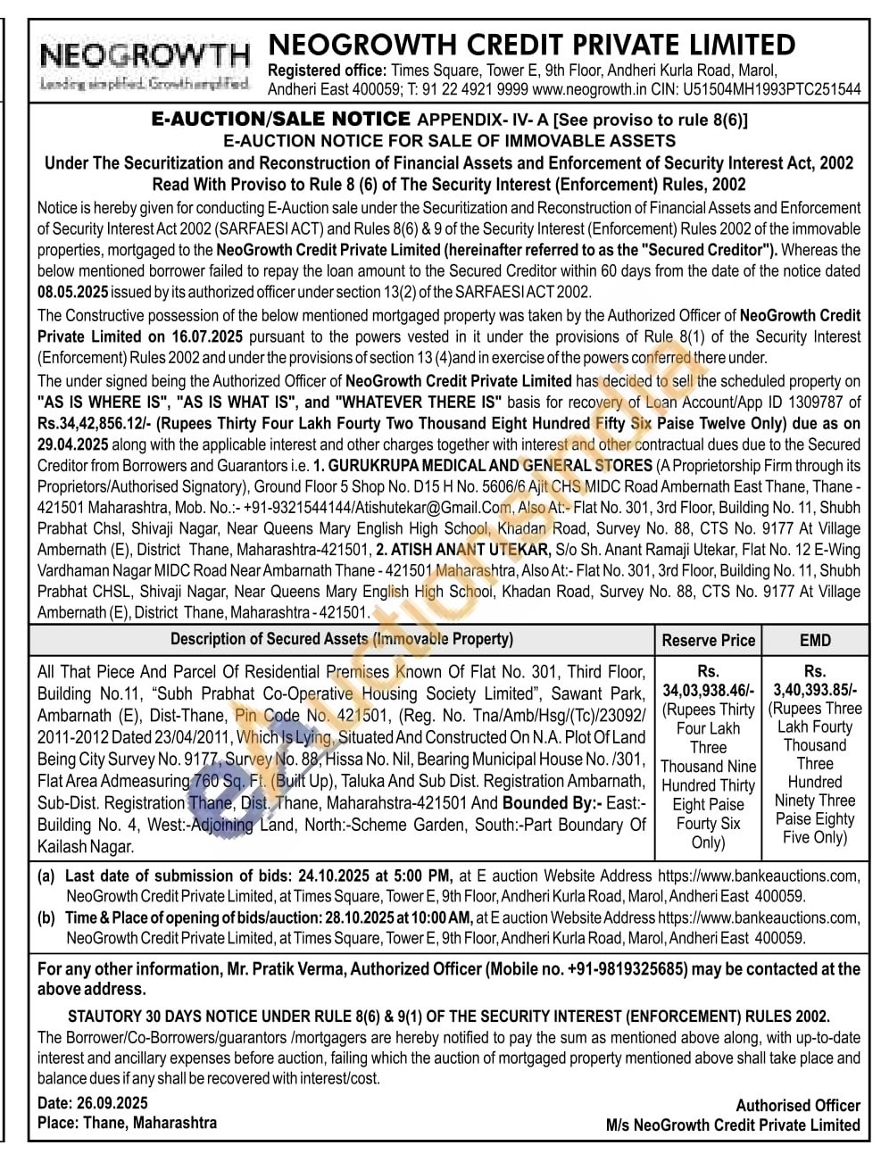 Contact Mr. Pratik Verma, Authorized Officer (Mobile no. +91-9819325685)