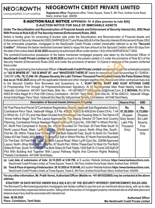 Contact Mr. Pratik Verma, Authorized Officer (Mobile no. +91-9819325685)