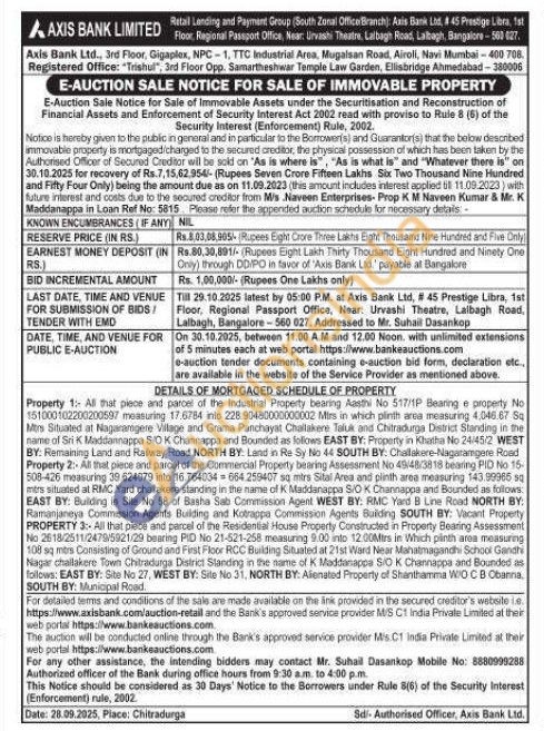 Property 1: All that piece and parcel of the Industrial Property bearing Aasthi No 517/1P Bearing e property No 151000102200200597 measuring 17.6784 into 228.90480000000002 Mirs in which plinth area measuring 4,046.67 Sq Mers Situated at Nagaramgere Village and Grama Panchayat Challakere Taluk and Chitradurga District Standing in the name of Sri K Maddannappa SIO K Chamnappa and Bounded as follows EAST BY: Property in Khatha No 24/45/2 WEST BY: Remaining Land and Railway Road NORTH BY: Land in Re Sy No 44 SOUTH BY: Challakere-Nagaramgere Road Property 2: All that piece and parcel of the Commercial Property bearing Assessment No 49/48/3818 bearing PID No. 15-508-426 measuring 39.624079 into 16.764034-664.259407 sq mitrs Sital Area and plinth area measuring 143.99966 90 mitrs situated at RIMC Yard challakere standing in the name of K Maddanappa S/O K Channappa and Bounded as follows: EAST BY: Building in Site No 58 of Basha Sab Commission Agent WEST BY: RMC Yard B Line Road NORTH BY: Ramanjaneya Commission Agents Buliding and Kotrappa Commission Agents Building SOUTH BY: Vacant Property PROPERTY 3:- All that piece and parcel of the Residential House Property Constructed in Property Bearing Assessment No 2618/2511/2479/5921/29 bearing PID No 21-521-258 measuring 9.00 into 12.00Mtes in Which plinth area measuring 108 sq mtrs Consisting of Ground and First Floor RCC Building Situated at 21st Ward Near Mahatmagandhi School Gandhi Nagar challakere Town Chitradurga District Standing in the name of K Maddanappa S/O K Channappa and Bounded as follows: EAST BY: Site No 27, WEST BY: Site No 31. NORTH BY: Alienated Property of Shanthamma WIO CB Obanna SOUTH BY: Municipal Road.