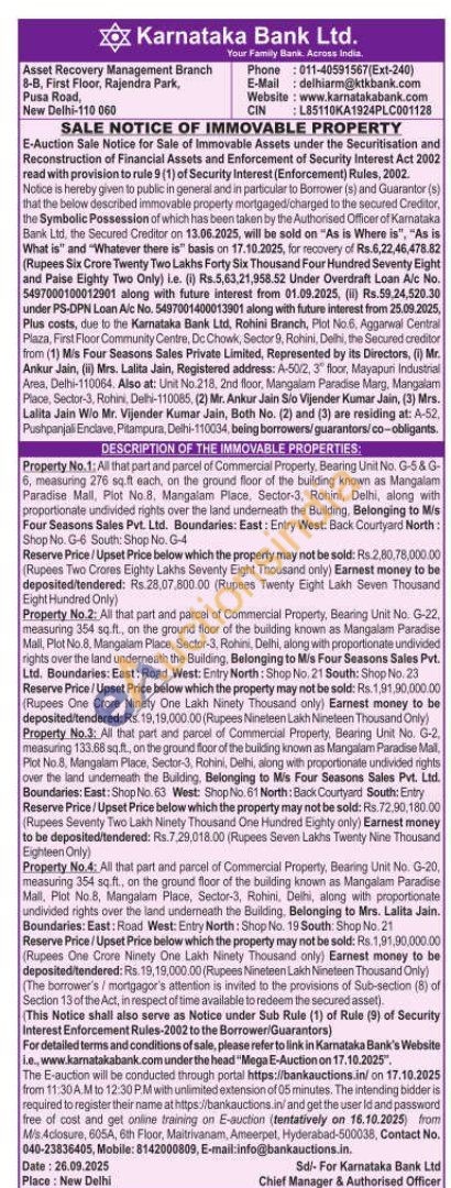 Property No.4: All that part and parcel of Commercial Property, Bearing Unit No. G-20, measuring 354 sq. ft., on the ground floor of the building known as Mangalam Paradise Mall, Plot No.8, Mangalam Place, Sector-3, Rohini, Delhi, along with proportionate undivided rights over the land underneath the Building. Belonging to Mrs. Lalita Jain. Boundaries: East: Road West: Entry North: Shop No. 19 South: Shop No. 21