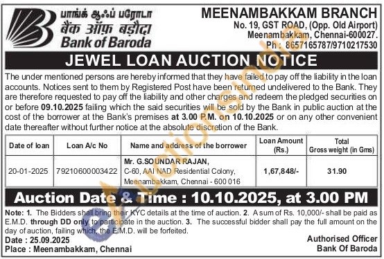Bank of Baroda Gold Auctions Auction in Chennai