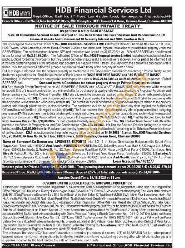 District Karur, Registration District Karur, Registration Sub District Mela Karur Sub Registration Office, Registration Office Mela Karur Registration Office Village LNS Taluk Karur, Survey Number Ayyan Purjai Survey No. 240, Plot No.8. Measurement of the property East West of the Northem Side 66 1/8 East West of the Southem Side 66% North South of the Both Sides 40 Total Extent of 2688 Sq.ft. Within Four Boundaries, North Plat No.7. South Plot. No.9, East: 30 North South Road, West: North South Road. Details of immovable Properties II. District Karur, Registration District Karur, Registration Sub District Mela Karur Sub Registration Office, Registration Office Mela Karur Registration Office, Village L.N.S Taiuk Karur. Survey Number Ayyan Punjai Survey No.240, Pict No 9. Measurement of the property East West of the Northem Side 63 East West of the Southem Side 66 1/8 North South of the Eastem Side 40 1/2 North South of the Western Side 43 3/4 Total Extent of 2716 Sq.ft Both the terms Calculating an extent of 5404 Sq.ft of land with entire building with Doors, Windows, Portiogo, Electric Connection No. 06-012-007-549, Meter and Meter Deposit, Borewell, Electric Motor Door No. 122, 122//1, and 122/2, Tax Assessment No. 16572, 16573, 16574 with usual Pathway from Karur Salem Bye Pass Road with all easementary rights, property situated at LNS Village, Karur Taluk, Sub Registration District of Mela Karur, Registration District Karur within the imits of Karur District, within the following four boundaries. North: Plot No.8, South:30 East West Road