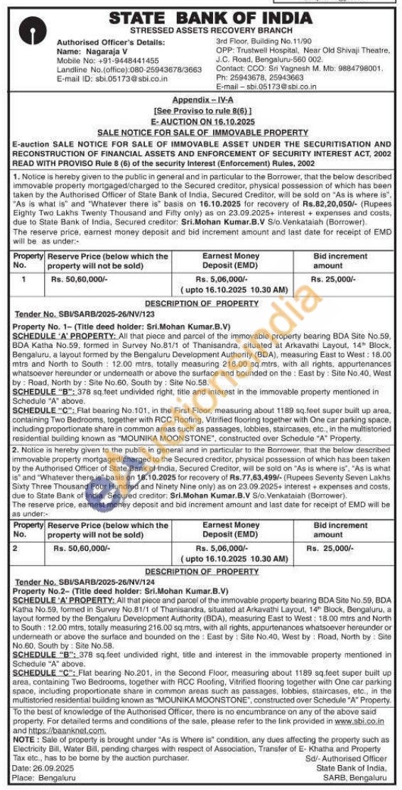 SCHEDULE 'A' PROPERTY: All that piece and parcel of the immovable property bearing BDA Site No.59. BDA Katha No.59, formed in Survey No.81/1 of Thanisandra, situated at Amaravathi Layout, 14" Block, Bengaluru, a layout formed by the Bengaluru Development Authority (BDA), measuring East to West: 18.00 mtrs and North to South 12.00 mtrs, totally measuring 216.00 sq.mtrs, with all rights, appurtenances whatsoever hereunder or underneath or above the surface and bounded on the East by: Site No.40, West by: Road. North by Site No.60, South by: Site No.58. SCHEDULE "B": 378 sq feet undivided right, title and interest in the immovable property mentioned in Schedule "A" above. SCHEDULE "C": Flat bearing No.101, in the First Floor, measuring about 1189 sq.feet super built up area. containing Two Bedrooms, together with RCC Roofing, Vitrified flooring together with One car parking space, including proportionate share in common areas such as passages, lobbies, staircases, etc., in the multistoried residential building known as "MOUNIKA MOONSTONE", constructed over Schedule "A" Property