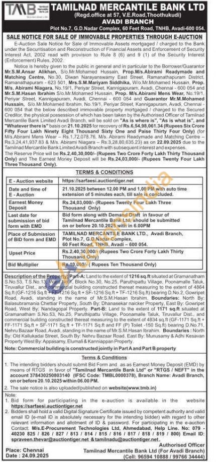 Land to the extent of 1216 sq.ft situated at Gramanatham S.No.53. TS.No. 13. Ward No.1, Block No.30, No.25, Paruthipattu Village, Poonamalle Taluk Tiruvallur Dist., and commercial building constructed thereat measuring to the extent of 4864 Sq.ft (GF-1216 Sq.ft+FF-1216 Sqft+SF-1216 Sqft+TF-1216 Sq.ft) bearing D.No.2. Gowripet Road, Avadi, standing in the name of Mr.S.M.Hasan Ibrahim. Boundaries: North By: Balasubramania Chettiar Property, South By: Dhanasekar naicker Property, East By: Gowripet Road, West By. Nandagopal Property. Part-B: Land to the extent of 1171 sq.ft situated at Gramanatham S.No. 53. No.25. Paruthipattu Village, Poonamalle Taluk, Tiruvallur Dist., and commercial building constructed thereat measuring to the extent of 4834 sq.ft (GF-1171 Sqft+ FF-1171 Sqft SF-1171 Sq.ft TF-1171 Sq.ft and FF (P) Toilet-150 Sq.ft) bearing D.No.71. Nehru Bazaar Road. Avadi, standing in the name of Mr.S.M.Hasan Ibrahim. Boundaries: North By: Old Kallukadai Street, South By: Nehru Bazaar Road, East By: Munusamy & Adhi Kesavan Property West By Appasamy, Elumali & Kanniappan Property