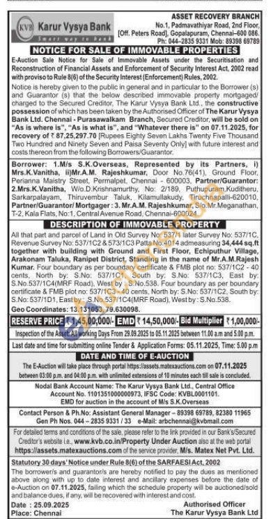 All that part and parcel of Land in Old Survey No: 537/1 later Survey No: 537/1C, Revenue Survey No: 537/102 & 573/1C3 Patta No:4014 admeasuring 34,444 sq.ft together with building with Ground and First Floor, Echiputhur Village, Arakonam Taluka, Ranipet District, Standing in the name of Mr.A.M.Rajesh Kumar. Four boundary as per boundary certificate & FMB plot no: 537/1C2-40 cents. North by: S.No. 537/1C1, South by: S.No: 537/1C3, East by: S.No. 537/1C4(MRF Road), West by S.No.538. Four boundary as per boundary certificate & FMB plot no: 537/1C3-40 cents, North by: S.No: 537/1C2, South by S.No: 537/1D1, Eastby: S.No.537/1C4(MRF Road), West by: S.No.538.