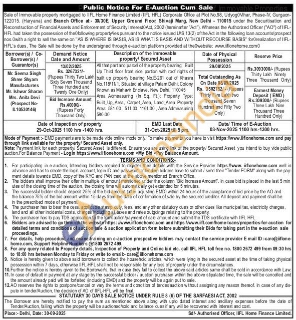 All that part and parcel of the property bearing: Built Up Third floor frant side portion with roof rights of built up property bearing No.E-261 out of Khasra No. 118/11/1, Situated at village Palam Delhi, Colony Known as Mahavir Enclave, New Delhi, 110045 Area Admeasuring (In Sq. Ft.): Property Type: Built Up Area, Carpet Area, Land Area Property Area: 581.00, 511.00, 1161.00, Ama Admeasuring 580.00