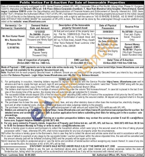 All that part and parcel of the property bear-ing: Flat No. 10B/B05/S-20, Floar No. 2, 1 admeasuring 245 sq. ft. (Carpet Area) and 367 sq. ft(Total Area), Awadh Pmay, Awadh Vihar Yojna Raibarell Road Lucknow, Uttar Pradesh, India, 226029