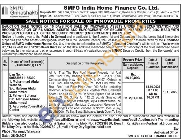 All That The Pcc Roof House Property 1st And 2nd Floor Only Bearing Gwmc H.ла. 9-2-174 (Old) Corresponding New No. 9-2-174/1, 9/197 (Oldest) In First Floor And Second Floor Roc Roof Only With The Roc Roof 1st Floor Plinth Area 960 Sq.fts Including Common Area And Balconies Together With Undivided Share Land Of 67 Sq.tds Or 56/01 Sq.mts Out Of Total Extent Of 134 Sq.yds Or 112.02 Sq.mts Situated At Charbouli, Girmajipet, Warangal City & District Within The Limits Of Warangal Municipal Corporation Revenue And Registration District And Bounded By North: Open To Sky, South: Open To Sky, East: Staircase, West: Open To Sky.