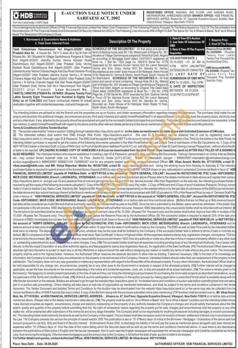 All that piece and parcel land containing house area 58.1 So, Meters part of Khasta No. 361 situated at Vitage Ganthepura pargana & Tehsil Koil Distt. Aligarh as according to Mortgage Deed dated 14/07/2017 registered at book no. 1 Zid No. 1223 page no. 385/414 Serial No. 3776 rexecuted by Sri Jitendra Kumar Verma S/O Sri Laxmi Narayan Verma and Smt. Dolyy Verma WIO Sn Jendra Kr. Verma th Boundaries as are under-East-House of SrNetrapal West-House of Sri Rajendra Kr. Verma & Others. North-Road, South House of Sri Balmukand SCHEDULE OF THE SECURITIES A piece and parcel of land containing House Area 26.4 Sq. Meters part of Khasra No. 361 situated at Village Gambhirpura Pargana & Sahui Koil Distt. Aligarh as According to Onginal Title Deed Sale Deed dated 23/09/2009 registered at Bock No. 1 Zils No. 2765 Bounded as-East-House of Sr Netrapal, West- Rasta 15 Feat Page No. 21/38 Serial No. 6797 executed by Simt. Sadhna Verma in Favor Of Sn Sin Jitendra Kunar Verma S10 S Laxmi Narayan Verma and Smt. Dolyy Verma WO Sn Jendra Kr. Varma North-Road South-Morigagor