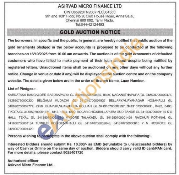 Asirvad Micro Finance Ltd Gold Auctions Auction in Bengaluru