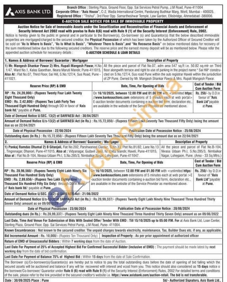 All the piece and parcel of Flat No.07, adm area 547 sq.ft i.e. 50.82 sq.mtr on Third , floor alongwith terrace and right to use of parking in the project name Sai Hill" constru - cted on S.No. 127/4, Sus road Pune within the sub registrar Haveli within the jurisdiction of ZP Pune. Owned by Mr. Mangesh Shankar Pawar & Mrs. Rupali Mangesh Pawar