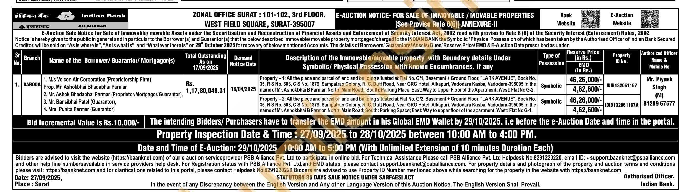 Property-2: All the piece and parcel of land and building situated at Flat No. G/2, Basement + Ground Floor, "LARK AVENUE", Bock No. 35, R S No. 503, C S No. 1879, Sampatrao Colony, R. C. Dutt Road, Near GRG Hotel, Alkapuri, Vadodara Kasba, Vadodara-395005 in the name of Mr. Ashokbhai B Parmar. North: Main Road; South: Parking Space; East: Way to upper floor of the apartment; West: Flat No G-1.