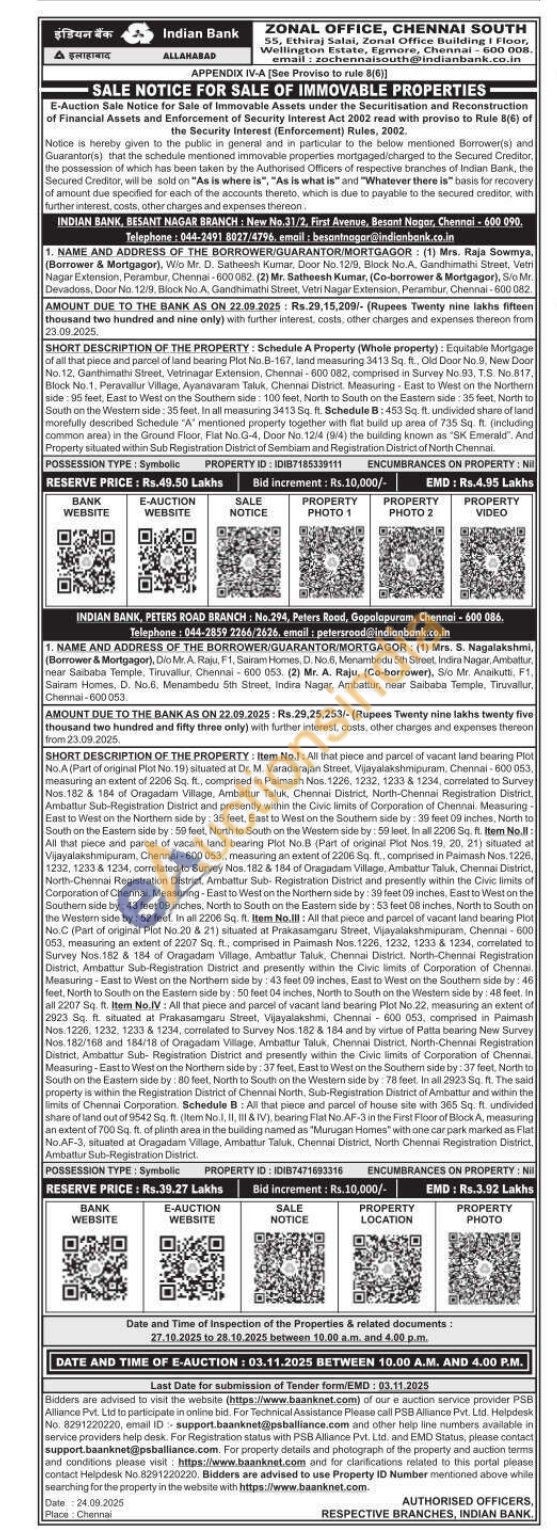 Equitable Mortgage of all that piece and parcel of land bearing Plot No.B-167, land measuring 3413 Sq. ft., Old Door No.9, New Door No. 12, Ganthimathi Street, Vetrinagar Extension, Chennai 600 082, comprised in Survey No. 93, T.S. No.817. Block No.1, Peravallur Village, Ayanavaram Taluk, Chennai District. Measuring East to West on the Northern side: 95 feet, East to West on the Southern side 100 feet, North to South on the Eastern side: 35 feet. North to South on the Western side: 35 feet. In all measuring 3413 Sq. ft. Schedule B: 453 Sq. ft. undivided share of land. morefully described Schedule "A" mentioned property together with flat build up area of 735 Sq. ft. (including common area) in the Ground Floor, Flat No. G-4, Door No. 12/4 (9/4) the building known as "SK Emerald". And Property sitsiated within Sub Registration District of Sembiam and Registration District of North Chennai.