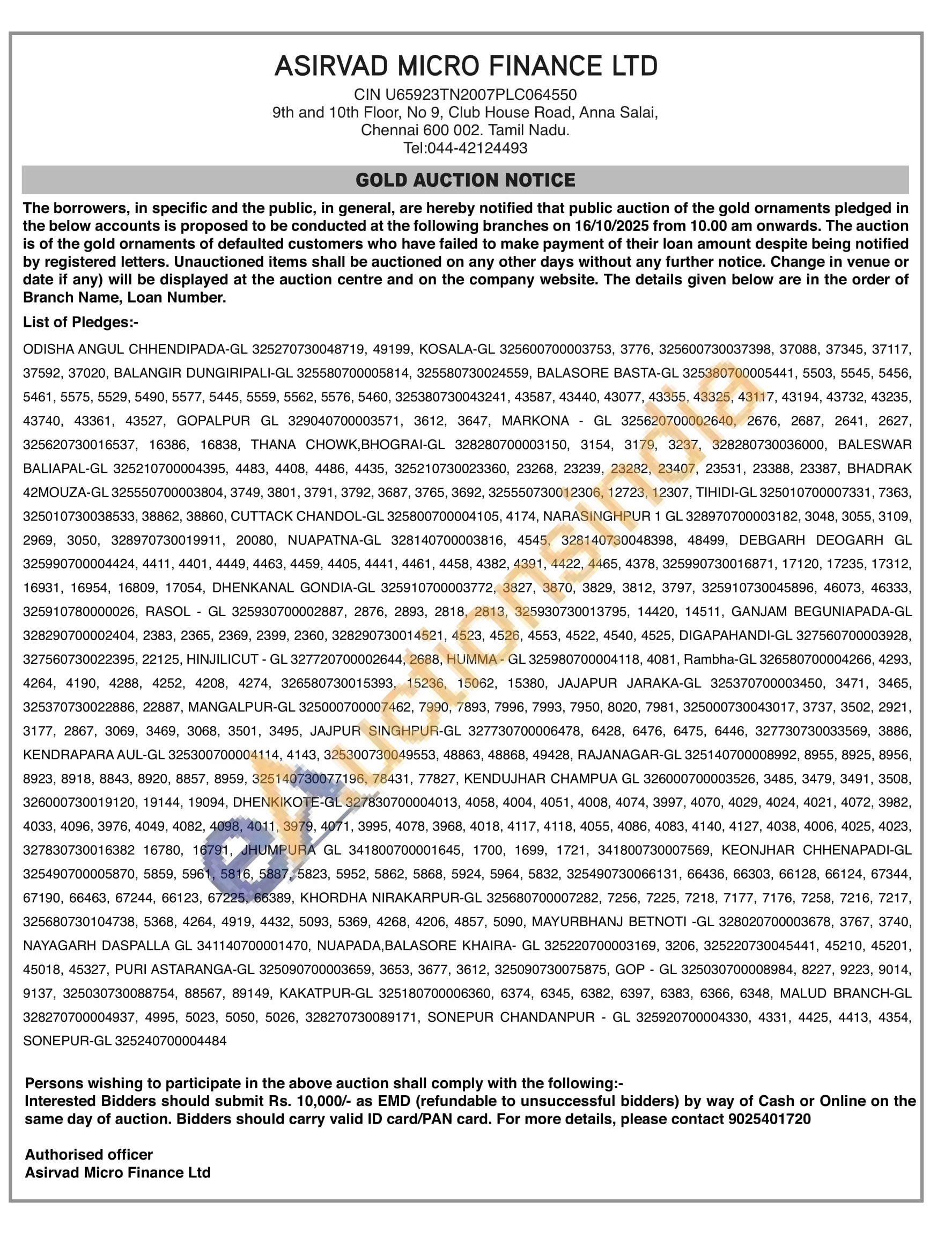 Asirvad Micro Finance Ltd Gold Auctions Auction in Chennai