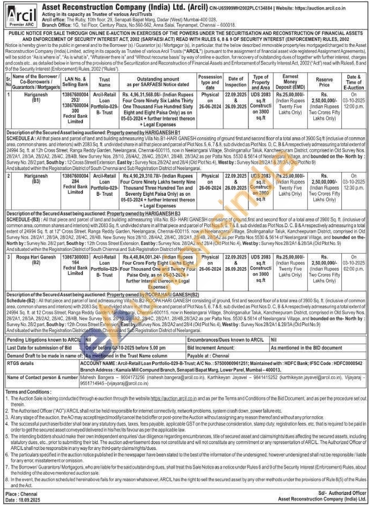 Description of the Secured Asset being auctioned: Property owned by ROOPA HARI GANESH (B2) : Schedule-(B2): All that piece and parcel of land admeasuring Villa No.B2-ROOPA HARI GANESH consisting of ground, first and second floor of a total area of 3900 Sq. ft. (inclusive of common area, common shares and interiors) with 2083 Sq. ft. undivided share in all that piece and parcel of Plot Nos 5, 6, 7 & 8, sub divided as Plot Nos D. C, B & Arespectively admeasuring a total extent of 24994 Sq. It. at 12 Cross Street, Ranga Reddy Garden, Neelangarai, Chennai-600115, now in Neelangarai Village, Sholinganallur Taluk, Kancheepuram District, comprised in Old Survey Nos. 28/2A1, 28/3A, 28/2A2, 28/4C, 28/4B, New Survey Nos. 28/10, 28/4A2, 28/40, 28/241, 28/48,28/342 as per Patta Nos. 5530 & 5614 of Neelangarai Village, and bounded on the North by: Survey No. 28/2 part, South by: 12th Cross Street Extension, East by: Survey Nos. 28/2A2 and 28/4 (Old Plot No. 4), Westby: Survey Nos 28/2A1 & 28/3A (Old Plot No.9) And situated within the Registration District of South Chennai and Sub Registration District of Neelangarai
