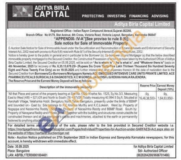 "All that Piece and parcel of the property bearing at Site No. 1525, Khatha No. 1525, Sy. No.3/3, Measuring East to West (4855213/2ft and North to South (7687)/2ft, Totally measuring 40,994.5 Sq.ft. Situated at Harohalli Village, Yelahanka Hobli, Bengaluru North Taluk, Bengaluru, presently under the limits of BBMP and bounded on:- East by: Site belongs to K.C.Krishna Murthy and K.C.Lokesh, West by: Property of Nagappa and Narasimha Reddy, North by. Property of Narasimha Reddy and BBMP Road, South by: Property of Narayana Reddy and Private Road. Together with the building and structures constructed to be constructed thereon and all the mortgagor's plants and machineries, attached to the earth or permanently fastened to anything attached to the earth.