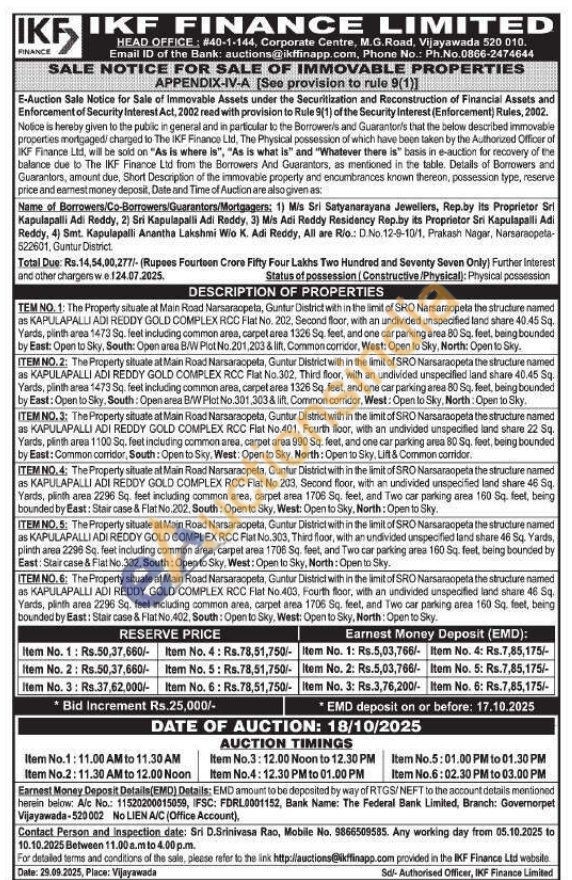 ITEM NO.4: The Property situate at Main Road Narsaraopeta, Guntur District with in the limit of SRO Narsaraopeta the structure named as KAPULAPALLI ADI REDDY GOLD COMPLEX RCC Flat No.203, Second floor, with an undivided unspecified land share 46 Sq. Yards, plinth area 2296 Sq. feet including common area, carpet area 1706 Sq. feet, and Two car parking area 160 Sq. feet, being bounded by East: Stair case & Flat No.202, South: Open to Sky, West: Open to Sky, North: Open to Sky.