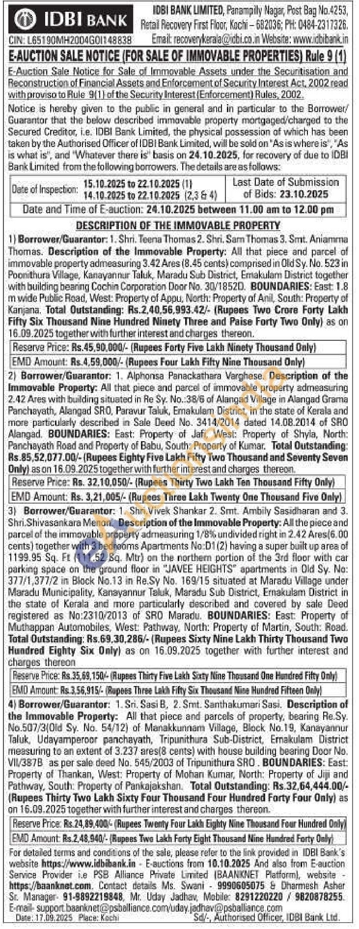 Description of the Immovable Property: All that piece and parcel of immovable property admeasuring 3.42 Ares (8.45 cents) comprised in Old Sy. No. 523 in Poonithura Village, Kanayannur Taluk, Maradu Sub District, Ernakulam District together with building bearing Cochin Corporation Door No. 30/1852D. BOUNDARIES: East: 1.8 m wide Public Road, West: Property of Appu, North: Property of Anil, South: Property of Kanjana